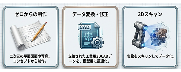 平面図面をもとに3DCADを使って3Dデザイナーがデータを制作する方法と、 3Dスキャナーを使って実物をスキャンし、そこからデータを制作する方法があります。もちろん、お客様のお持ちの実際の3DCADデータを元にデータを簡略化して模型を作成することもできます。キャラクターや動物等の3DCG(ポリゴンデータ)とプロダクトの3DCADデータをミックスしてデザインすることも可能です。その場合は3Dデザイナーがお客様のご意向をヒアリングしたうえで、イラスト/写真/現物/コンセプト等から3DCGソフトおよび3DCADを使用して3Dデータを作成します。制作するカテゴリーや形状によって、その分野が得意なデザイナーをアサインします。1回分の修正費は、初期見積もりに含まれています。